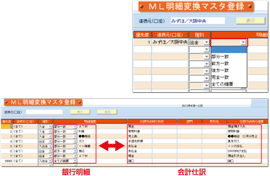 ML明細変換マスタ登録は、口座、入金・出金別に分けて設定することができ、銀行明細の摘要は、部分一致や完全一致などで読み取りの精度を変えて登録することもできます。どの条件でも合致しない場合は、一旦「諸口」等の仮勘定にて取込むので、取込み漏れもありません。 |